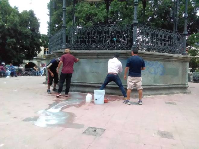 Markoa Vasquez artista plástico en compañía de mas compañeros se dan cita en el kiosco de la ciudad capital molestos, ya que alguien realizo pintas en este inmueble histórico, por lo que hace una invitación a las diferentes organizaciones para que expresen sus inconformidades de otra manera.