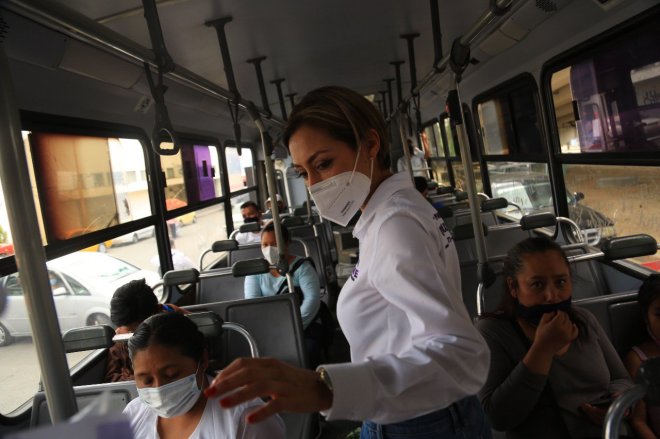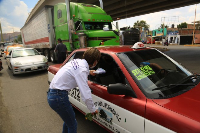 Se dio cita en el crucero de la Agencia de cinco señores, apoyando con las medidas sanitarias ante la pandemia del COVID-19, donde obsequió gel antibacterial así como cubre bocas a automovilistas así como a usuarios del servicio del transporte público.