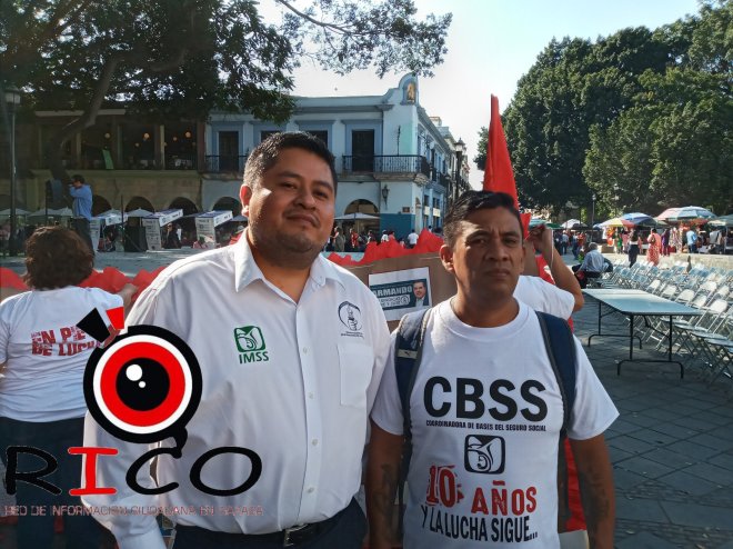 Omar Gerardo Mariscal Secretario de Prensa del Sindicato Nacional Libre de los Trabajadores del Seguro Social Sección Oaxaca, en compañía de José Silva Jiménez encargado del Enlace Político de la Coordinadora de Bases del Seguro Social, dan a conocer la actividad a realizar bajo el laurel del zócalo capitalino celebrando el décimo aniversario de la coordinadora.