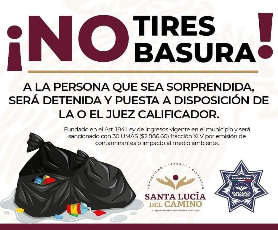 Esta administración que encabeza el Presidente Municipal Juan Carlos García Márquez, reitera su compromiso de velar por la salud pública de todas y todos los ciudadanos de Santa Lucía del Camino, por lo que recuerda que la persona que sea sorprendida tirando basura en la vía pública, será acreedora a su detención y puesta a disposición de la o el juez calificador.