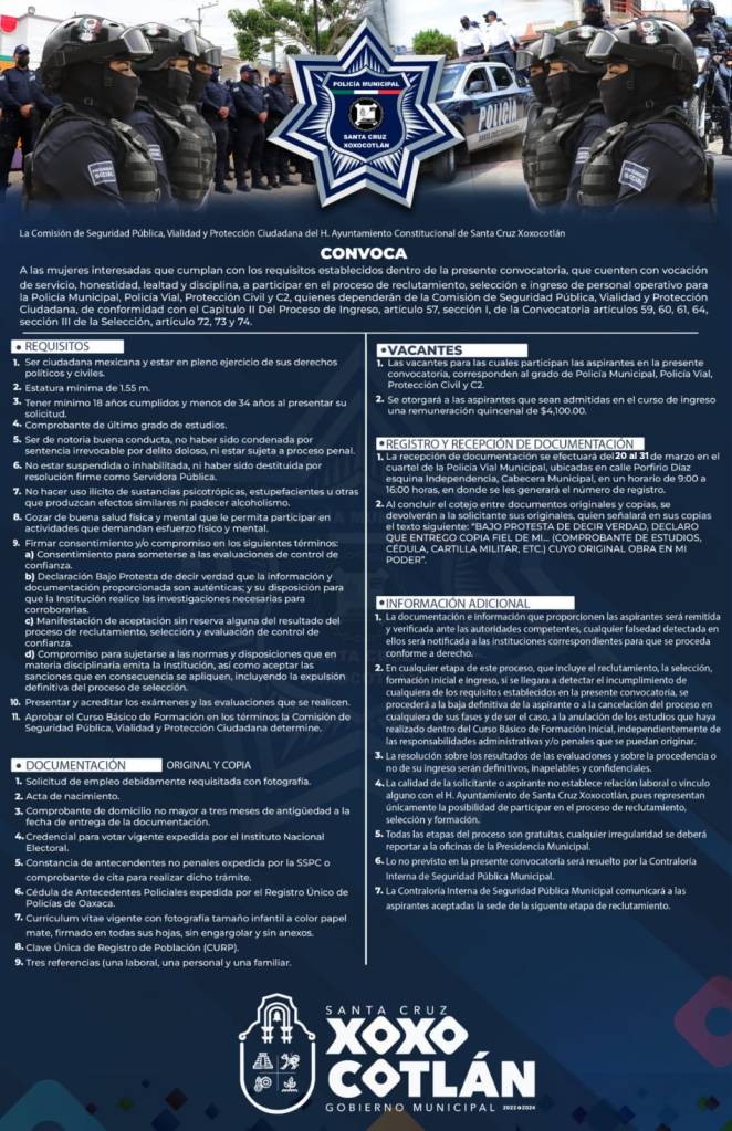 El H. Ayuntamiento de Santa Cruz Xoxocotlán, que encabeza el Dr. Chente Castellanos, convoca a mujeres de 18 a 34 años de edad a formar parte de la Comisión de Seguridad Pública, Vialidad y Protección Ciudadana.