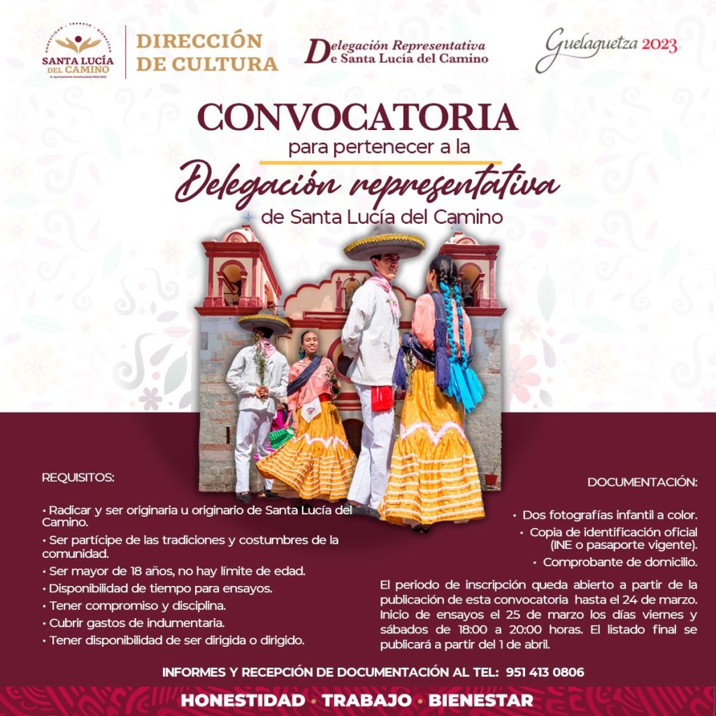 El H. Ayuntamiento de Santa Lucía del Camino, a través de la Dirección de Cultura, convoca a las y los habitantes de este municipio, a participar en la convocatoria para pertenecer a la Delegación Representativa en las Fiestas de la Guelaguetza 2023.