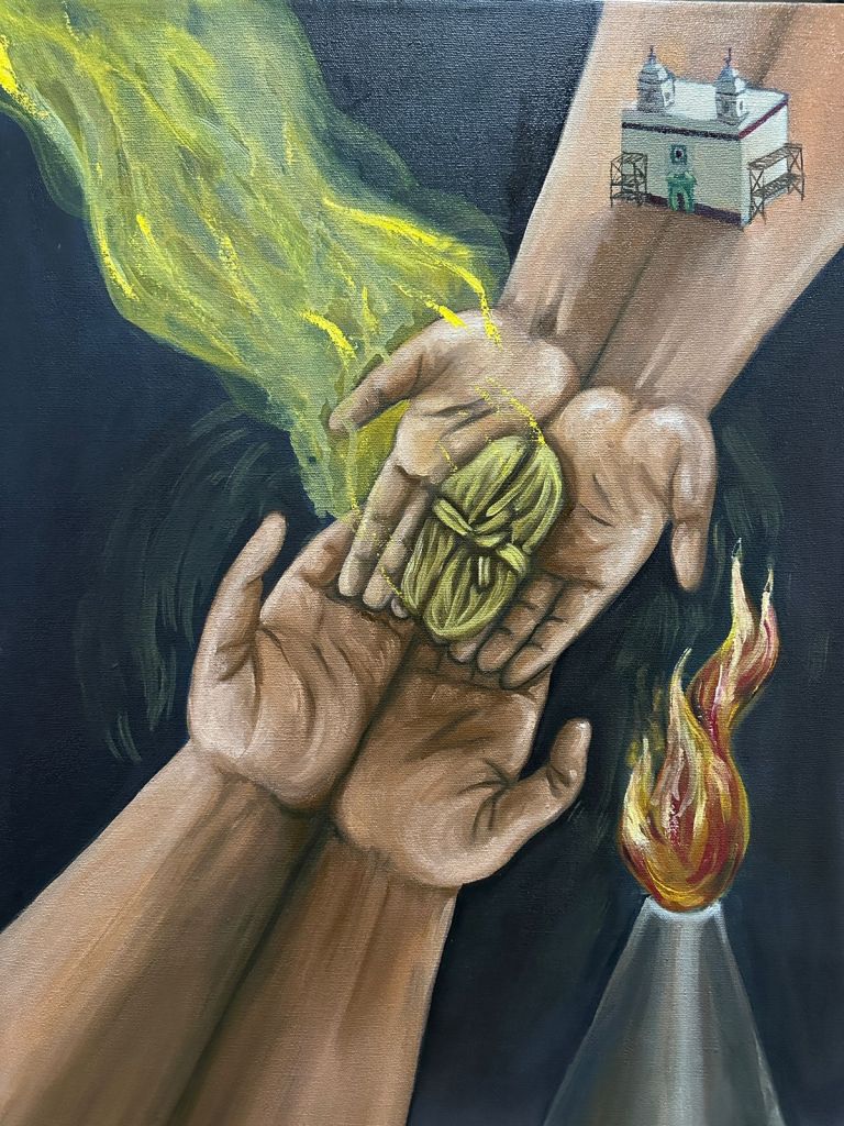 Por su parte, el joven originario de la Cabecera Municipal explicó que su obra simboliza la unidad entre personas, principalmente entre hombres y mujeres; por eso en ella se aprecian las manos calentadas por la flama que dio origen a los tradicionales Martes de Brujas y que sumó a la unidad para la construcción del templo y las tradiciones.