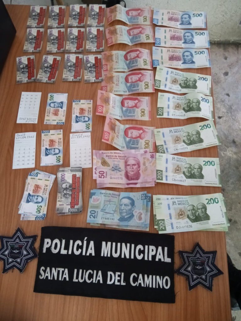 Tras realizarse una inspección a su persona, la Policía Municipal de Santa Lucía del Camino localizó la cantidad de $3,980.00 PESOS en efectivo, así como tarjetas de presentación con la leyenda “Créditos al instante con negocios propios”.