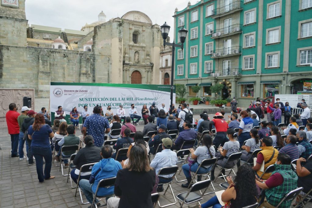 Por una vital, esplendorosa y verde transformación del zócalo de la ciudad, el día de hoy, se llevó a cabo la presentación del Guamúchil, ejemplar que con su sombra cobijará a cientos de oaxaqueños y que sustituye al emblemático laurel.