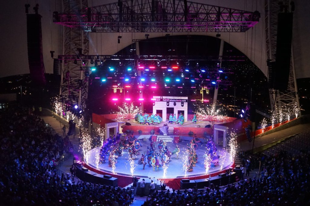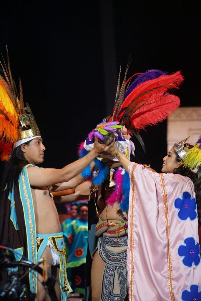 Oaxaca de Juárez, Oax., a 31 de julio de 2022. Eran las 20:30 hrs., cuando miles de asistentes quedaron impresionados con las imágenes prehispánicas plasmadas en la velaria del majestuoso Auditorio Guelaguetza, y guerreros mexicas del emperador Ahuítzotl, con antorchas en mano, recorrían los pasillos de la Rotonda de la Azucena, que sincronizaba con la narración de la llegada de una niña, producto del amor entre último rey zapoteca, Cosijoeza, y la reina Coyolicatzin: Donají.