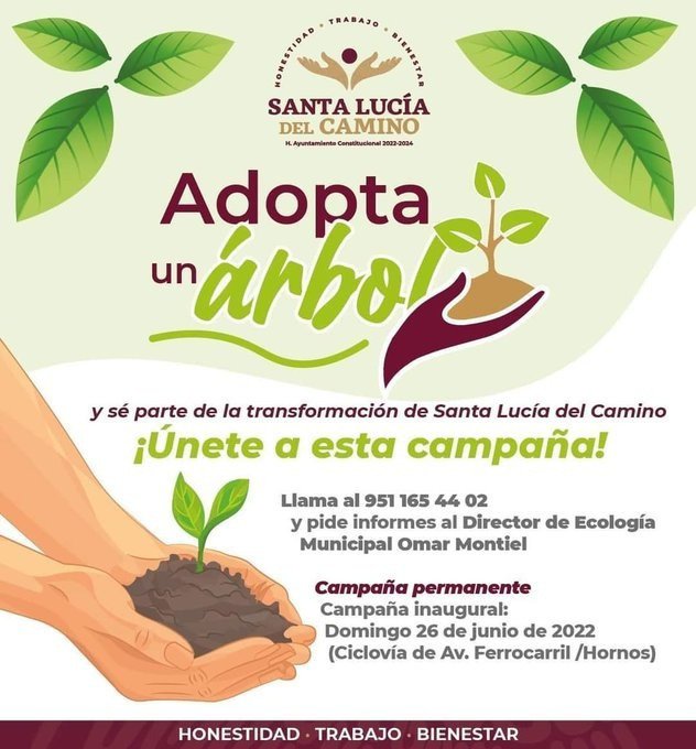 Tomando la reforestación como una práctica para mejorar el medio ambiente y así erradicar el calentamiento global, el H. Ayuntamiento de Santa Lucía del Camino pondrá en marcha la campaña “Adopta un árbol”; con la que además, se busca mejorar la imagen de nuestro municipio.