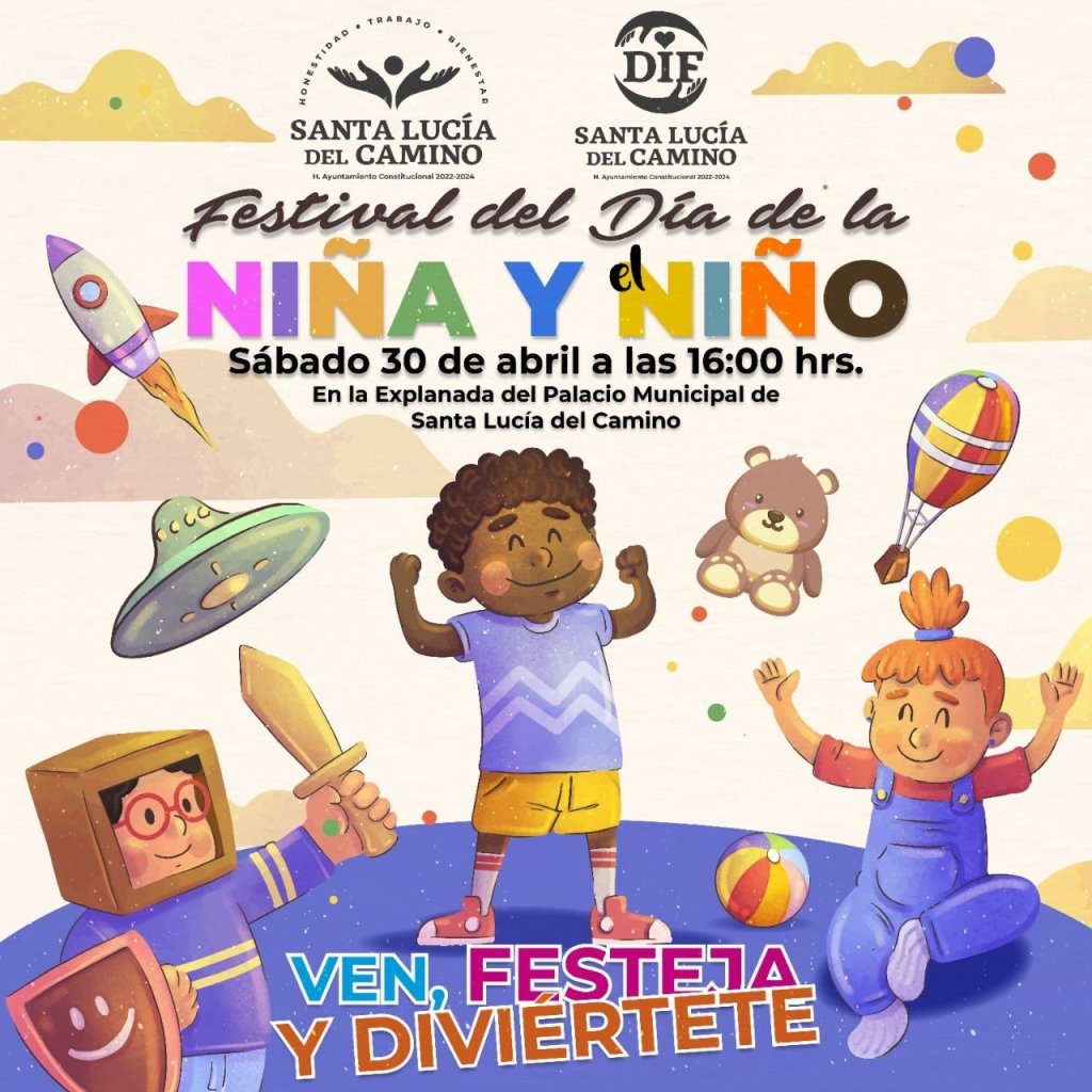 En este Festival de la Niña y el Niño, a realizarse el próximo sábado 30 de abril a partir de las 16:00 horas en la explanada del Palacio Municipal del H. Ayuntamiento de Santa Lucía del Camino; habrá regalos, brincolines y animadores, una fórmula que asegura hora de diversión para las niñas y niños.