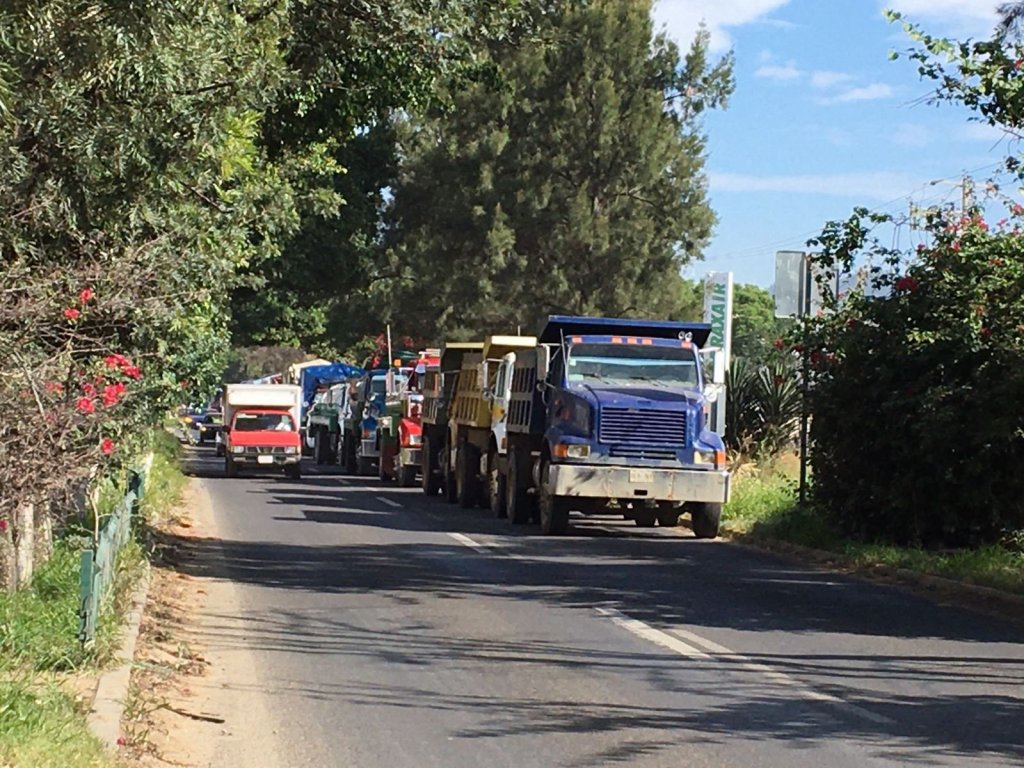 Más de 300 camiones pesados, entre plataformas, pipas y camiones volteo, permanecen estacionados en la avenida Símbolos Patrios, para presionar a la Confederación Autónoma de Trabajadores y Empleados de México (CATEM), para compartir la obra de ampliación y modernización que se lleva a cabo en la zona.
