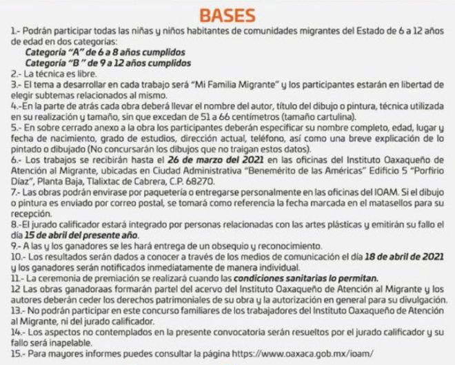 13.- No podrán participar en este concurso familiares de los trabajadores del Instituto Oaxaqueño de Atención al Migrante, ni del jurado calificador.